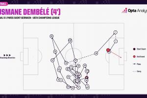 据Opta统计,登贝莱的进球经过连续26次传球,这是2003-2004赛季有相关统计以来,巴黎在欧冠连续传球次数最多的进球。
