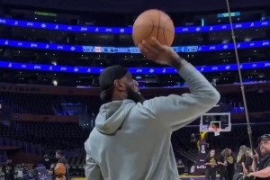 詹姆斯在结束热身前一边激情说唱Eminem的歌曲,一边尝试在底角单手投三分。在第三投命中后,詹姆斯心满意足地离开了场地。