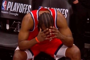 比赛结束后哈登在替补席抱头,看起来非常失落!
