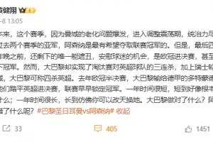 黄健翔:“本来,这个赛季,因为曼城的老化问题爆发,进入调整震荡期,统治力尽失,作为过去两个赛季的亚军,阿森纳是最有希望夺取联赛冠军的。但是,最后四大皆空。昨晚之前,还剩下的唯一能遮丑,安慰球迷的机会,是欧冠进决赛,甚至,憧憬一下冠军。然而,大巴黎却实现了淘汰赛对英超球队的三连杀,加上瑞士轮4:2曼城,大巴黎可称四杀英超。去年欧冠半决赛,大巴黎输给德甲的多特蒙德,今年,他们踏平英超进决赛,联赛早早锁定冠军。一年时间很短,短到好像根本来不及做什么;一年时间很长,长到仿佛你可以改天换地。大巴黎做对了什么?阿森纳又做错了什么呢?”