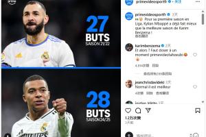 体育资讯05月19日讯 媒体Prime Video Sport France在ins上比较姆巴佩与本泽马数据:本泽马2021/2022赛季在皇马取得27粒进球,而姆巴佩本赛季取得28粒进球(现为29粒,编者注),并配文:姆巴佩在西甲的第一个赛季的表现已经超过了本泽马的最佳赛季!