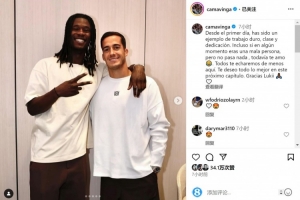 卡马文加社媒晒出与巴斯克斯的合照,并写道:“从第一天起,你就是勤奋、优雅和奉献的典范。即使有时候你是个‘坏家伙’,但没关系,我还是爱你😂。”
