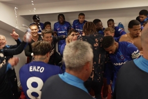 赛后切尔西球员们在更衣室内庆祝并合影,俱乐部官方社媒晒出视频,配文:“英超24-25赛季收官。”