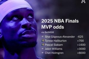 体育资讯6月3日讯 NBA总决赛,雷霆将对阵步行者。博彩网站更新了系列赛FMVP的赔率: