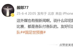 记者在社媒写道:这外媒也有假新闻啊。说什么印尼队给国足出房费?一点逻辑都没有。世预赛这种比赛,都是各队付各队的。友好归友好,但没道理替对手付费啊。