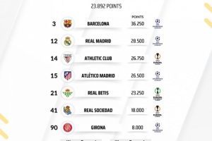 体育资讯6月6日讯 2024-25赛季的欧战赛事已全部结束,数据机构Football Rankings公布了西甲球队欧战积分排名情况,巴萨36.25分全欧第3,皇马第12位,马竞第15位。