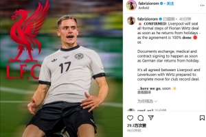 罗马诺写道:“确认:利物浦将在维尔茨结束度假归来后完成所有正式手续,转会协议已100%敲定。”