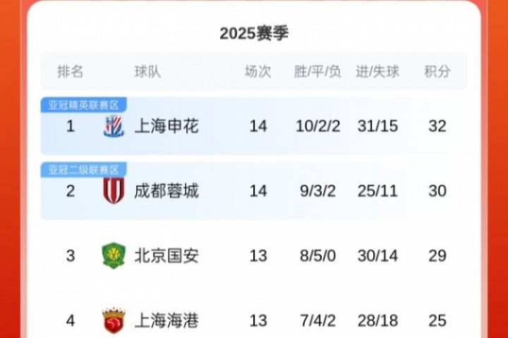 国安上来了!中超前二申花、蓉城输球 国安小胜少赛一场距榜首3分