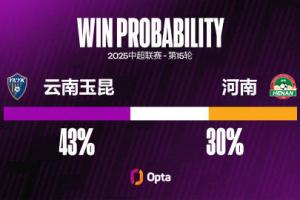 今晚20:00,河南队将客场挑战目前排名中超第8名的云南玉昆。根据OPTA预测,云南玉昆有43%几率获胜,而河南队有30%几率获胜。