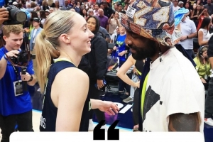 在本场比赛中,独行侠球星欧文现场为飞翼状元秀佩奇助威,赛后二人还一起合影、拥抱致意。