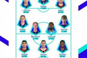 体育资讯1月28日讯 意甲官方宣布了第22轮比赛的最佳阵容,帕夫洛维奇、邓弗里斯、劳塔罗、弗拉泰西等入选。