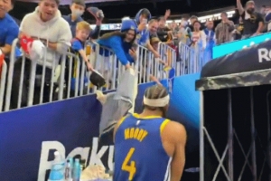 赛后,勇士球员穆迪和波杰姆斯基在进入球员通道前,将自己的装备脱下扔给球迷。