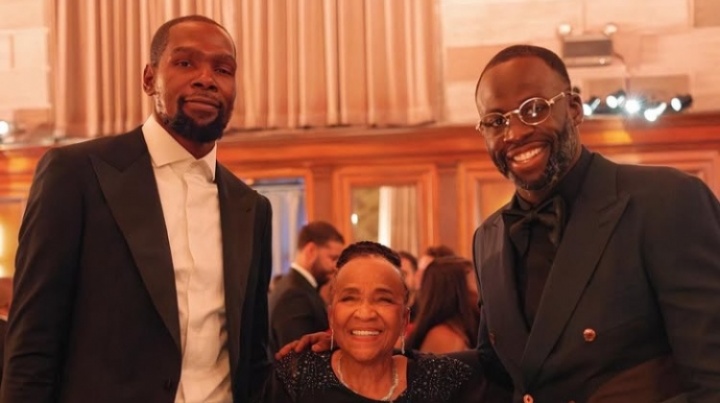 哥俩好😄杜兰特追梦一同参加美女记者婚礼 俩人微笑合影