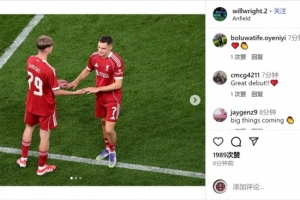 威尔-赖特在利物浦对阵毕尔巴鄂的热身赛中替补出场,他在社交媒体上晒出照片,表达自己的喜悦之情。