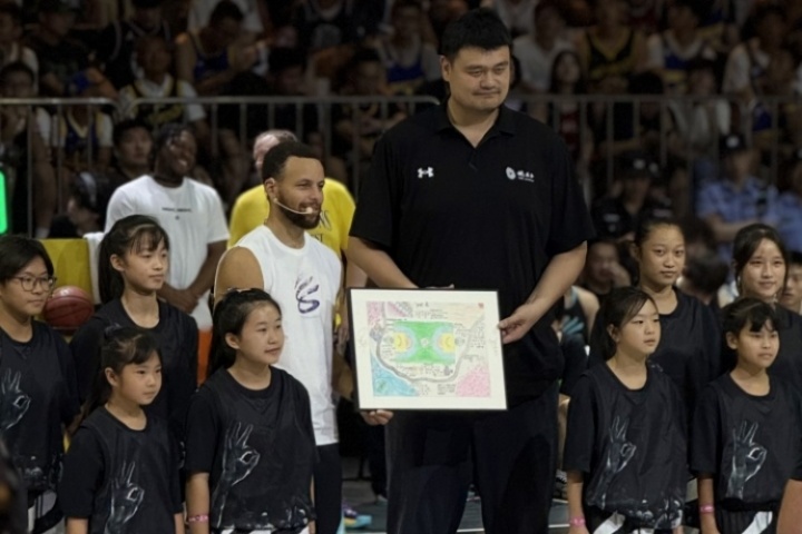两代人的青春!姚明中场上台致辞 与库里展现最萌体型差!