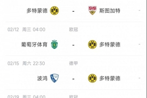 多特2月8日22点30分在德甲主场对阵斯图加特,2月12日4点欧冠淘汰赛附加赛首回合客场对阵葡萄牙体育,2月19日4点次回合主场对阵葡萄牙体育。