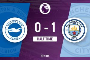 上半场伤停补时3分钟,半场结束,曼城暂1-0布莱顿。