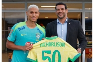 理查利森晒出与纪念球衣的合照,配文:“为国家队出战50场比赛!💚💛谁能想到那个来自新维尼西亚的孩子会穿上这件球衣,并达到这一里程碑?”