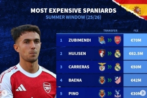 今夏西班牙球员转会费榜:苏维门迪压赫伊森居首,A费&巴埃纳在列
