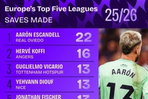 体育资讯9月12日讯 Squawka统计了本赛季门将在五大联赛的扑救次数,并列出榜单。