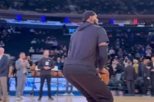 赛前热身环节,詹姆斯在中圈位置闲庭信步,抬手飚进超远三分,展示了超强的力量和手感。