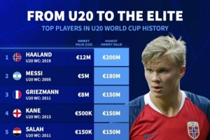德转统计U20世界杯球星身价变化:梅西500万→1.8亿,哈兰德最高
