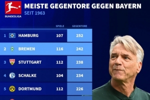 体育资讯9月26日讯 本周五晚拜仁即将在主场迎战不莱梅,德国转会市场网统计了德甲成立以来面对拜仁丢球数最多的10支球队,其中汉堡排名第一,不莱梅就位居第二。