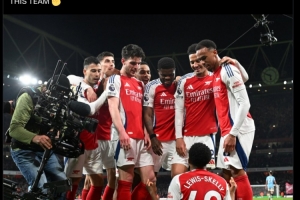 阿森纳社媒晒出斯凯利模仿哈兰德庆祝时,其余球员围绕着他的照片,并写道:这支球队。