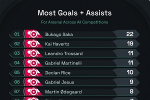 体育资讯2月3日讯 英超第24轮比赛,阿森纳主场5-1击败曼城。据Squawka统计,本赛季5名阿森纳球员参与进球10+,其中萨卡参与22球最多,哈弗茨参与19球第二多。