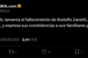 体育资讯9月30日讯 国米、阿根廷名宿萨内蒂的父亲在不久前去世,南美足联也发推表示了哀悼。