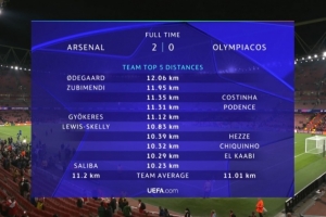 阿森纳球员本场跑动距离榜:厄德高12.06km居首,苏维门迪次席