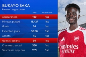 体育资讯10月4日讯 萨卡将迎来英超出战200场里程碑,天空体育统计了萨卡首秀以来的英超数据,他的出场次数、进球、助攻等多项数据阿森纳队内同期居首。