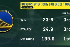 巴特勒加盟后 勇士防守效率联盟第一!战绩&罚球联盟第三