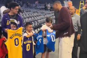 😦威少给小球迷的球衣签名 签了雷霆和火箭的唯独略过了湖人的
