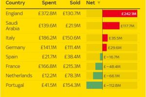1、英格兰:支出3.728亿;卖出1.307亿;净支出2.421亿