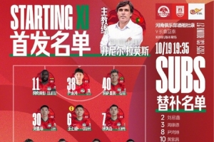 中超第27轮,河南俱乐部酒祖杜康VS长春亚泰 首发及替补队员名单