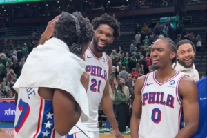 球队新宠!埃奇库姆首秀34分 采访时恩比德马克西等人泼水庆祝