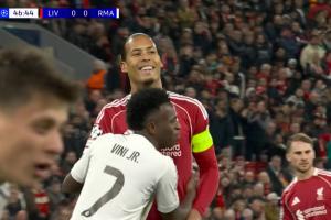 这是认真的吗?1米76维尼修斯角球盯防1米95范戴克,两人嘻嘻哈哈