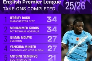 本赛季英超成功过人榜:多库、库杜斯并列居首,内托、萨卡在列