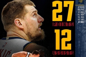 赛季个人第七次三双!掘金官方晒约基奇本场数据:27分10板12助
