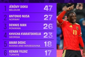 世欧预成功过人榜:多库47次居首,克瓦拉茨赫利亚、伊尔迪兹在列