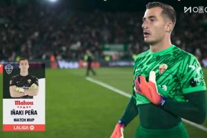 完成5次扑救!官方:埃尔切门将佩尼亚当选全场最佳球员