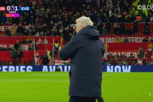 体育资讯11月25日讯 埃弗顿本轮1-0击败曼联,完场哨响后,莫耶斯振臂庆祝,随后和阿莫林握手。