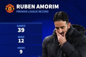 阿莫林执教曼联英超战绩:12胜9平18负,净胜球-10,场均1.15分
