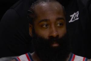 在想什么?比赛已无悬念 哈登眼神黯淡无光 小卡轻抚嘴唇若有所思