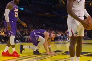 詹姆斯本想去扶起被推倒的东契奇 见后者怒火中烧默默退出战场