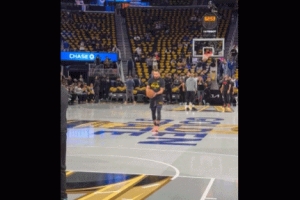 老粉已经开始流汗!库里赛前热身小试牛刀 logo三分两连中