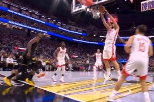 波杰上篮不中 篮板出界裁判吹火箭球权 勇士挑战成功拿回球权