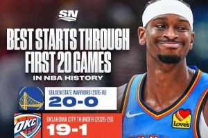 仅次于15-16勇士!雷霆开季前20场19胜1负 与三队并列历史第二