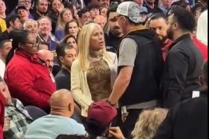 有球迷晒出视频,昨日比赛中,有一位坐在湖人板凳席旁边的女球迷疑似在不断骚扰湖人球员,被多名保安强制请出场外。